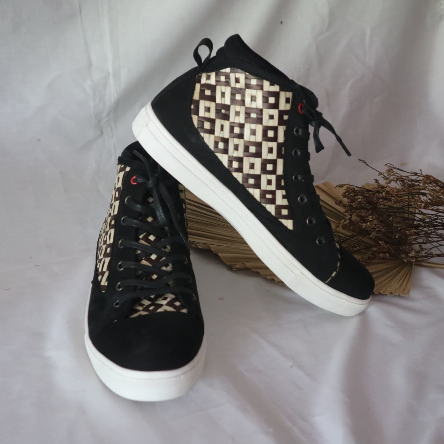 Sepatu sneakers hitam putih unik dengan kombinasi anyaman pandan alami dan material kulit sintetis berkualitas. Dirancang untuk kenyamanan dan gaya, cocok digunakan sehari-hari, tampil beda dengan sentuhan tradisi khas Kampoeng Anyaman.